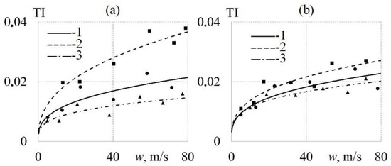 Dependences of turbulence intensity TI on average air velocity w in round (1), square (2), and triangular (3) pipes without a turbulator (average TI = 0.02) for control sections: (a) lx = 100 mm; (b) lx = 300 mm.