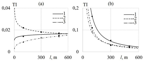 Dependences of turbulence intensity TI along the length of (1) round, (2) square, and (3) triangular pipes for average air velocity w = 20 m/s and at initial values TI: (a) TI = 0.02; (b) TI = 0.12.