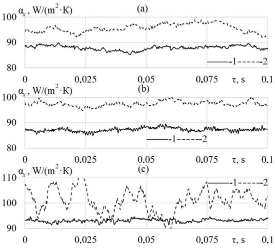 Dependences of the instantaneous values of the local (lx = 100 mm) heat transfer coefficient αx over time at the flow turbulence intensity TI = 0.02 (1) and TI = 0.12 (2) in pipes with different cross-sections: (a) round (average rate w ≈ 13 m/s); (b) square (w ≈ 13 m/s); (c) triangle (w ≈ 12 m/s).