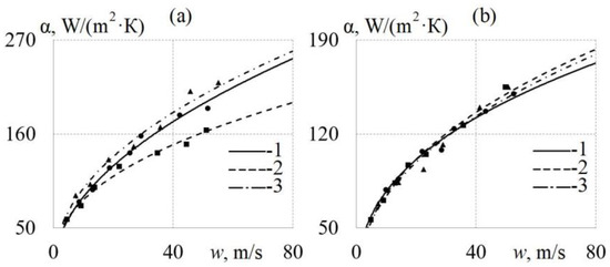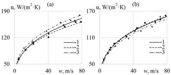 Dependences of the local heat transfer coefficient α on the average air velocity w in round (1), square (2), and triangular (3) pipes with a turbulator (TI = 0.12) for different control sections: (a) lx = 100 mm; (b) lx = 300 mm.