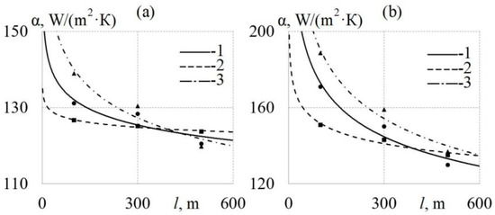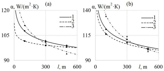 Figure 10 shows the dependencies α = f (lx) for straight pipes with different cross-sections and gas-dynamic conditions. At an average air rate of w = 20 m/s in the absence of initial flow turbulence, the following patterns of changes in local heat transfer along the length of straight pipes are observed (Figure 10a):