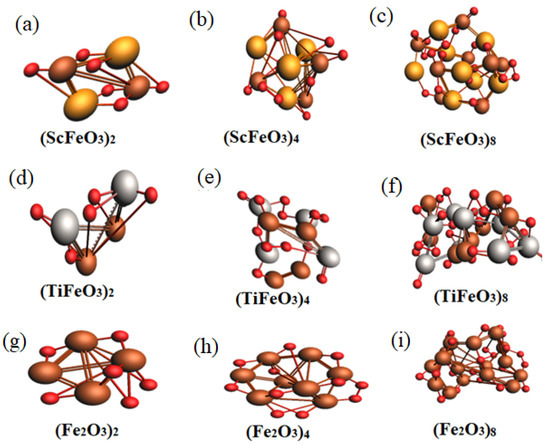 Optimized structures of (TMFeO3)x molecular clusters for x = 2, 4, 8 and TM = Sc, Ti, Fe showing geometry of the clusters (a) (ScFeO3)2, (b) (ScFeO3)4, (c) (ScFeO3)8, (d) (TiFeO3)2, (e) (TiFeO3)4, (f) (TiFeO3)8, (g) (Fe2O3)2, (h) (Fe2O3)4, and (i) (Fe2O3)8.