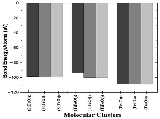 The formation for these clusters takes place after relevant phase transition to configure a new set of relaxed structures [40]. The values of formation energy determined using Equation (1) are found as −25.114 eV, −56.538 eV, and −120.49 eV for the respective clusters of (ScFeO3)X for x = 2, 4, 8. The bridge-like structure of the starting clusters is changed to complex formation. The values for formation energy for x for x = 2, 4, 8 are found as −24.394 eV, −65.438 eV, and −140.14 eV, respectively. The values of formation energy calculated for x for x = 2, 4, 8 are −33.63 eV, −69.25 eV, and −141.47 eV, respectively. The binding energy sheds light on the dissembling of system of particles into their constituents such as TM, Fe, and O [41]. The values of binding energy calculated for the clusters are shown in Table 1, according to which x for x = 2, 4, 8 exhibits the respective values of 25.11eV, 56.53 eV, and 120.49 eV. For x with TM = Ti, Fe and x = 2, 4, and 8, the respective values of EB are 24.39 eV, 65.43 eV, and 140.14 eV and 33.63 eV, 69.25 eV, and 141.47 eV.