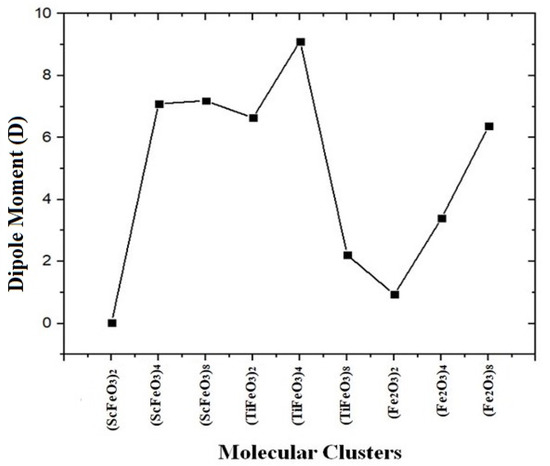 It is observed that electrons are transferred from TM atoms to Fe and oxygen as per the literature [42]. The dipole moment computed for (Fe2O3)2 clusters is 0.936 D, which is enhanced to 3.39 D and 6.63 D for the clusters (Fe2O3)4 and (Fe2O3)8, respectively. Similarly, in the case of (TMFeO3)x, where TM = Sc, due to the difference in number of unpaired electron (charge) electrons, Ti moves from TM to Fe and hence to oxygen atoms. For (ScFeO3)2, the dipole moment is 0.052 D, which is enhanced to 7.09 D and 7.18 D for the clusters (ScFeO3)4 and (ScFeO3)8, respectively. Finally, in the case of (TiFeO3)2, the dipole moment is 2.21 D, which is enhanced to 6.637 D and 9.11 D for the clusters (TiFeO3)4 and (TiFeO3)8, respectively. The trend in dipole moment of the clusters is sketched in Figure 3.