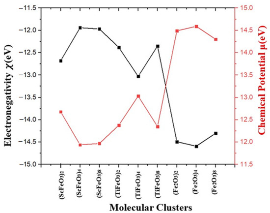 In the case of (ScFeO3)4 and (ScFeO3)8, HOMO and HOMO-1 energy values are −13.21 eV and −13.23 eV and −12.99 eV and −13.01 eV, respectively. LUMO and LUMO+1 for both these clusters are at −10.68 eV and −10.65 eV and −10.95 eV and −10.91 eV, respectively. The computed values of electronegativity and chemical potential for the series of studied clusters is shown in Figure 4.