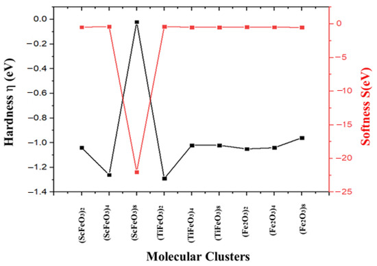 Since Ti is more electropositive than Fe and Fe is more electropositive than O, an electron moves from Ti to Fe and hence from Fe to O. The contribution of the electron transfer rate for Ti is about 49.38%, 52.12%, and 51.67% and for Fe is 28.21%, 24.46%, and 27.99% for the respective clusters . The number of unpaired electrons in Ti lies between Sc and Fe, due to which it is more electropositive than Fe and thus electrons transfer from Ti to Fe and then to O. The computed values showing trend of softness (eV) and hardness (eV) for the entire series of the clusters are given in Figure 5.