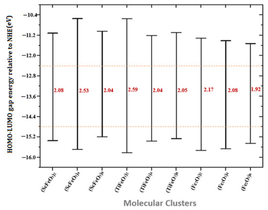 The contribution from cation 3d orbitals is observed increased when the size of the clusters is increased in all cases. The computed results indicated that (TiFeO3)2 is least reactive and (Fe2O3)8 is more suitable for operation with a TiO2-based photoanode. The comparative view of HOMO and LUMO energy levels with their band gaps positioned relative to normal hydrogen electrode potential is shown in Figure 7. The photocatalytic water splitting requires semiconductors having band gaps greater than 1.23 eV with CBM and VBM straddling the respective hydrogen evolution reaction and oxygen evolution reaction [47,48]. Thus, the investigated clusters seem to offer tunable electronic structure for use in photocatalytic applications.