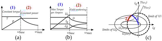 An inverter-fed PMSM (Figure 1) is used to control the field-weakening strategies (illustrated in Figure 2). At low speeds under the base speed (), the torque is kept at a constant maximum and the power is linear to the torque depending on the speed.