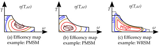 The efficiency of a motor is related to the speed and torque and is often expressed by an efficiency map [42,43,44], which describes the efficiency () as a function of the torque and speed (). Although comparing them makes it clear that PMSM have a high general efficiency due to lower rotor power losses, WRSM gain advantages due to the variable flux [45]. PMSM have some regions with high efficiency, whereas WRSM can optimize the operation of the FW current to improve the area of high efficiency [12]. This can be seen in the comparison in Figure 4.
