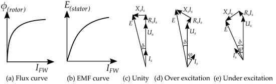 The rotor flux is variable through the field current (as seen in Figure 7a), and the magnitude of the alternating stator flux controls the induced back EMF of the stator windings (as seen in Figure 7b). The control of the EMF can be used to control the load angle between E and since the stator output voltage is