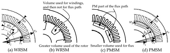 Comparison of geometry of WRSM (a,b) and PMSM (c,d). The field windings (b) take up space within the rotor volume, compared to PM-based rotors (c).