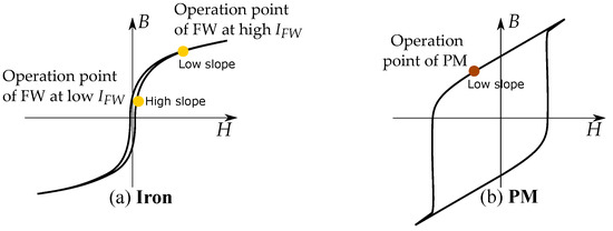 It should also be noted that the risk of PM demagnetization is increased at higher temperatures for most permanent magnets [51], which is relevant when placing PMs combined with currents since they may become heated. These risks are highly dependent on the material, for example, heating clearly could reduce the remanent flux density () and the coercivity () of neodymium magnets (due to the low Curie temperature of NdFeB) but this is not as clear for SmCo magnets (with a higher Curie temperature). A hybrid excitation needs to place the magnets in a way that voids the heating from the field current. However, ferrite instead has an increased coercivity () at increased temperatures and could have an advantage in this context. Some demagnetization-related parameters can be seen in Table 2 [52,53].
