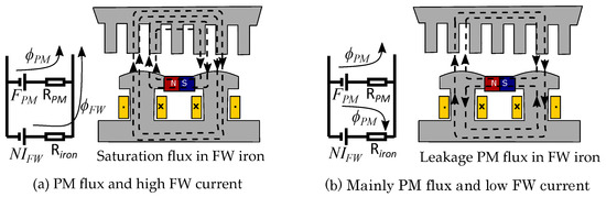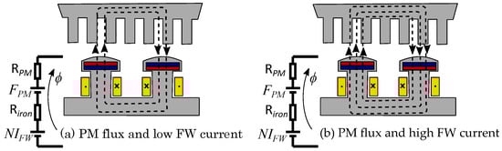In motor applications, this can be used to improve the performance of machines that are operated at a wide range of speeds. The benefits are related to field weakening [37,38], where the power and torque can be controlled depending on the operation speed. Such benefits have been studied by Cinti et al. [34], who compared PM machines and HE machines, and showed the advantages of operating with a good efficiency at variable speeds. Such strategies for flux weakening in hybrid excitation have been studied by Giulii-Capponi et al. [39,40], Amara et al. [29], ShahMohammadi et al. [32], and Michieletto et al. [41].