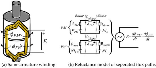 - Mizuno, T.; Nagayama, K.; Ashikaga, T.; Kobayashi, T. Basic principles and characteristics of hybrid excitation synchronous machine. Electr. Eng. Jpn. 1996, 117, 110–123. [Google Scholar] [CrossRef]