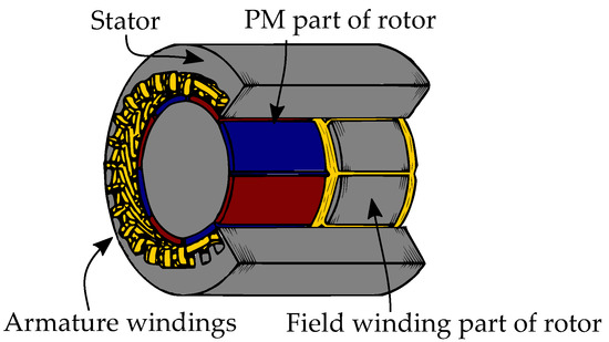 The main advantage of electric excitation by field windings is the control of the variable flux density. By introducing hybrid excitation, the field current can be reduced by the addition of permanent magnets, which decreases losses and the related cooling.