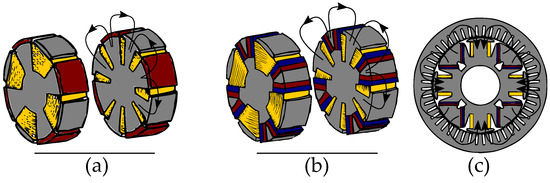 The name “hybrid excitation” is the most commonly used term in the literature to describe these machines, but they are also referred to by many other names throughout the literature, such as double-excitation synchronous machines, dual-excitation synchronous machines, or combined-excitation synchronous machines [9,10,14]. Other names that more specifically describe the methods for combining one additional source with a main source are also used. These are “Permanent magnet synchronous machines with auxiliary exciting windings” [24,25], or wound-rotor synchronous machines with “assisting permanent magnets” [26,27,28].