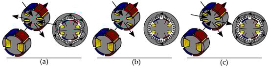 Hybrid excitation can be used to improve the torque–speed relation of relative conventional PMSM [32] (illustrated in Figure 3). At low speeds, the torque can be increased by a higher back EMF, E, considering that the torque is given by
