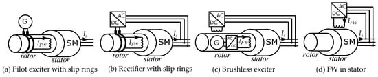 - Nøland, J.K.; Nuzzo, S.; Tessarolo, A.; Alves, E.F. Excitation System Technologies for Wound-Field Synchronous Machines: Survey of Solutions and Evolving Trends. IEEE Access 2019, 7, 109699–109718. [Google Scholar] [CrossRef]