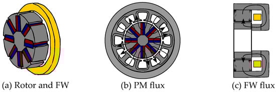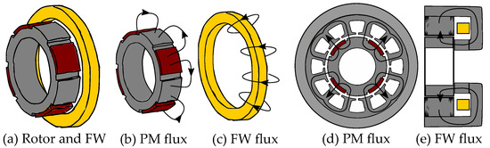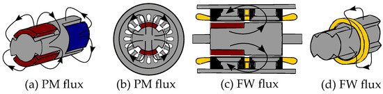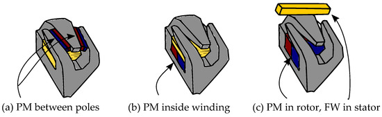 Rather than seeing hybrid excitation as a combination, there is also an alternative approach that considers one as a support of the other, where either the PM or the FW is considered the main source of excitation and the other excitation only acts as an additional support. One such approach considers the field winding as the main source with the assistance of permanent magnets [26,27,28,35,36], whereas the opposite strategy considers the PM as the main source with additional support from the FW [24,25].