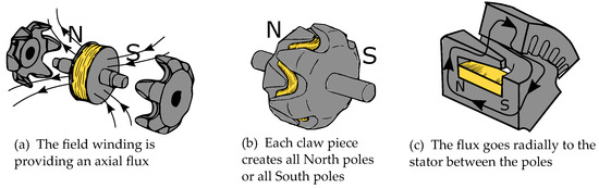 - Finken, T.; Hameyer, K. Study of Hybrid Excited Synchronous Alternators for Automotive Applications Using Coupled FE and Circuit Simulations. IEEE Trans. Magn. 2008, 44, 1598–1601. [Google Scholar] [CrossRef]