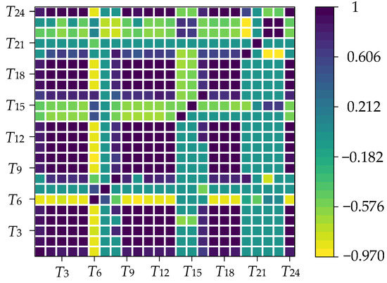- Use the K-nearest neighbors (KNN) idea to iterate repeatedly on each feature dimension and update the weight W(Tp) of each feature Tp (p = 1, 2, …,24) according to Formula (3).