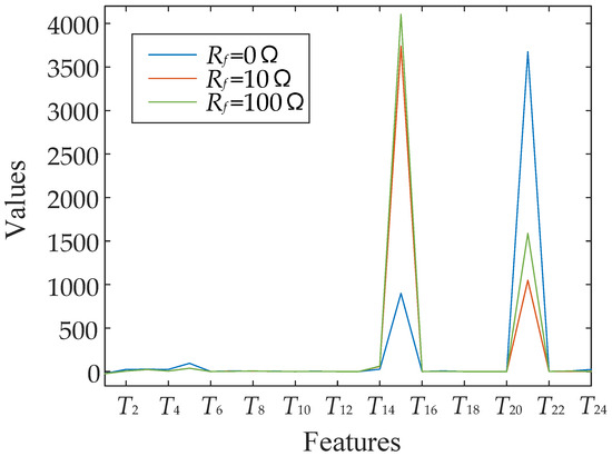 - According to the aerial mode current, 11 time-domain features and 13 frequency-domain features are calculated to form the original multi-feature parameter table.
