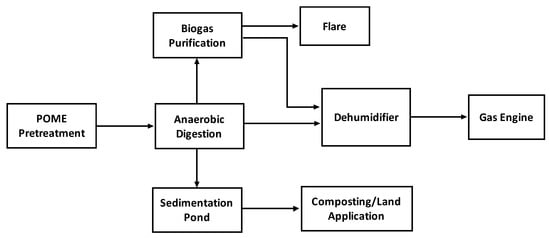 The yearly expansion of oil palm plantations in Indonesia is accompanied by an increase in the number of palm oil mills that produce crude palm oil (CPO) from fresh fruit bunches (FFB). The production process in a palm oil mill consists of sterilization, stripping, clarification, and palm kernel oil recovery [1]. This generates solid waste and liquid waste. This waste, when discharged directly into the environment without proper treatment, can pollute the environment, emitting greenhouse gases (GHG) that cause global warming. The composition of the waste produced by palm oil mills is mostly palm oil mill effluent [1,2]. Palm oil mill effluent (POME) is mostly generated from the stages of sterilization, clarification, and hydro-cyclone operation in palm oil mills [1]. Production of 1 ton of CPO requires about 5 to 7.5 tons of water, and nearly 50% of the water used ends up as POME [1]. POME contains very high levels of organic matter, such as a biochemical oxygen demand (BOD) of 8200–35,400 mg/L, chemical oxygen demand (COD) of 15,103–65,100 mg/L, and total solid (TS) of 16,580–94,106 mg/L [3]. Therefore, discharging it directly into the environment without appropriate treatment can cause various negative environmental impacts, such as water pollution and global warming.