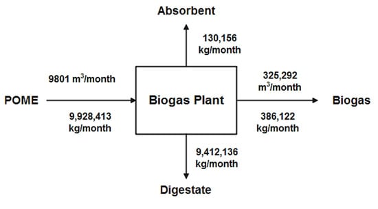 A techno-economic analysis was carried out quantitatively, adjusting to the biogas production process from POME, which was applied at the study site. A process flow diagram, total mass balance, and energy conversion diagram were used to help analyze the biogas production process from POME and the process efficiency. With the energy conversion diagram, the heat loss can be calculated, so that energy conversion efficiency can also be known. In addition, the potential energy in the biogas and energy consumed for electricity generation were analyzed. Previous studies have also applied mass or energy balance to analyze the anaerobic digestion system to produce renewable energy. For example, this method has been applied to study the anaerobic digestion for domestic food waste [34], anaerobic digestion to produce biogas from industrial waste [35], anaerobic digestion in the rice–wine–pig system [36], and anaerobic digestion to produce biogas from microalgae [37]. Furthermore, mass or energy balances make it possible to evaluate the bioconversion efficiency carried out by microbes, to convert complex organic substrates [38].