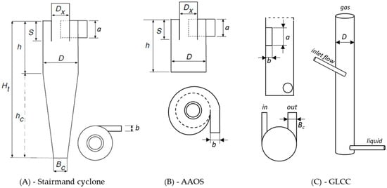 Cyclone separators are one of the most common separation devices used in various industries. The principle of their operation consists in using a centrifugal force to separate fractions of the introduced mixture. Three types of separation can be distinguished: solid particles from a liquid, liquid from gas or gas from liquid. The main advantages of these devices are compactness and simplicity of design, which result in a low construction cost. Another advantage of cyclones is that they can be used in a wide range of operating conditions. A standard cyclone is made of the inlet part, the cylindrical part and the conical part. The structure of the main geometric parameters are: the inlet dimensions (for a rectangular inlet: height and width ), the cylindrical part—diameter , the cylindrical part—height , the cyclone—total height , the cone—outlet diameter , the vortex finder—diameter and length (Figure 1A). This is the most common geometry for the separation of solid particles from a gas or liquid. For most standard cyclones and hydrocyclones, these are the characteristic dimensions that make it possible to determine their efficiency and the pressure drop using empirical models developed based on empirical testing results [,,,,,,]. Adequate selection of geometric quantities can improve the separator performance. Analysing to-date reports on the aircraft air–oil separator [,,,], it was found that its geometry (Figure 1B) was not much different from the standard cyclone used for the removal of particulates from gases, and the separation phenomenon was similar to that occurring in gas–liquid cylindrical cyclone (GLCC) separators (Figure 1C) used in the petrochemical industry. This particular type is most often used to separate gas from a liquid or to separate one liquid from another. In order to compare the AAOS geometry with other types of cyclone separators, their basic geometric dimensions are listed in Table 1 compared to the diameter of each separator type. The values of the AAOS ratios for the inlet channel dimensions and and the vortex finder diameter are not significantly different from those which demonstrated high separation efficiency in the testing performed by Stairmand []. The difference in the ratio is the effect of the fact that the analysed AAOS does not have a conical part. There is no conical part in the GLCC design, so and the difference in the ratio is 2–14× bigger due to the different use and different operating conditions. There is no vortex finder, either, which means that . As shown in [,,,], changes in the ratios between these parameters may have a substantial impact on the flow field, and consequently on the separator operation efficiency.