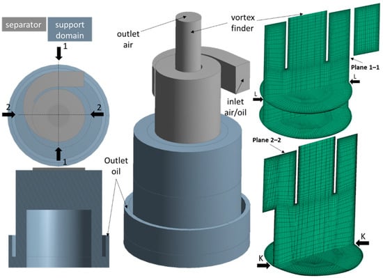 The computational domain (Figure 2) consisted of the AAOS model (marked in grey) and the auxiliary domain (grey-blue). The top left-hand corner of the figure shows a top view of the fluid domain with two marked planes: 1–1 and 2–2; below is a cross-section of the auxiliary domain with a marked oil outlet. On the right side of the figure, there is a cross-section of the separator with the numerical grid marked in two planes.