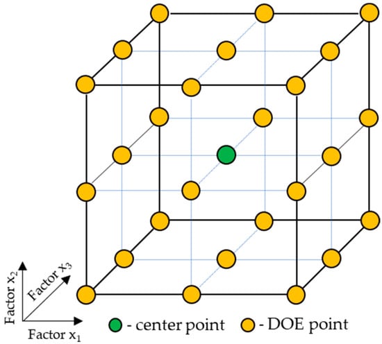 The standard approach in optimisation is to check the influence of one parameter, keeping the others constant, until optimal performance for operating conditions is found. The analysis of a single parameter is often time-consuming and may fail to detect possible interactions between other parameters. One of the popular methods for finding relations between parameters is DOE. The choice of the design of the experiment (DOE) depends on its objectives and the number of parameters to be investigated. In order to get the response and interactions of any combination of parameters, a multivariate parametric study was conducted. Before the analysis can be performed, the DOE has to be selected from a number of proposals. A method based on the RSM, popular in solving engineering problems, was used for this purpose. In the case of the RSM, it is good for the DOE to have the right features, such as satisfactory distribution across the entire design space and rotability []. The most common are: the central composite circumscribed (CCC) design, the central composite inscribed (CCI) design, the central composite face-centred (CCF) design, the full factorial array 3 level, the Box–Behnken design and the orthogonal array. The main factor affecting the choice of the DOE was to find a configuration that would reduce the number of computational cases, providing at the same time the opportunity to describe the separator behaviour in the entire available design space. The DOE should provide the most information about the output quantities and ensure the lowest possible uncertainty of the prediction of their future values. Assuming a nonlinear relationship, at least 3 levels are required for each factor. The CCI and the CCC design were rejected because of the large number of points due to the occurrence of 5 levels for each factor. For the CCC design, some calculation points would be outside the assumed design space. The CCF design is poor at a precise estimation of coefficients and is not rotable. The Box–Behnken method and the orthogonal array have combinations of points within the design space, but they lack points in the corners, which may be important due to the uncertainty of values predicted within the selected range of geometric dimensions. Therefore, the selected DOE is the Full Factorial Array 3 Level (Figure 4). Although it is not rotable, it has evenly distributed points throughout the entire design space, has points occurring in the corners and is symmetrical. This DOE type is not often used because its computational cost increases significantly with a rise in the number of parameters. However, if this number is kept low, the design becomes acceptable.