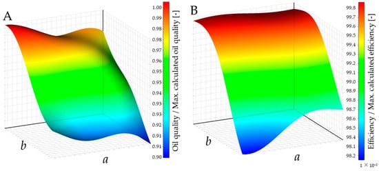 (A) Oil quality response surface; (B) Efficiency response surface.