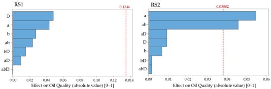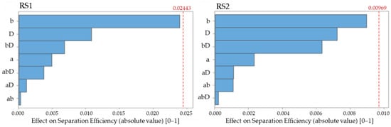 A comparative Pareto analysis was conducted for the two variants of the design of the experiment described above: RS1 and RS2. The bars that cross the red dashed line on the Pareto charts in Figure 6, Figure 7 and Figure 8 show which terms are statistically significant. The red dashed line represents a significance level of 0.05, which indicates a 5% risk of the wrong association between the response and each term.
