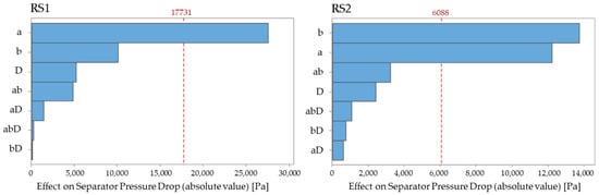 In the case of the pressure drop, parameter is significant for RS1, whereas the other parameters ( and ) are not. For the RS2 variant, both and are significant parameters (Figure 8).
