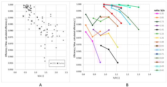 (A) b/a ratio impact on efficiency; (B) h/D ratio impact on efficiency.
