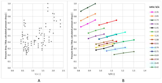 (A) Pressure drop vs. b/a ratio; (B) Pressure drop vs. the h/D ratio.