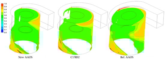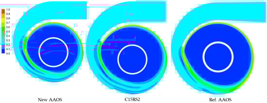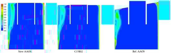 The flow structures are compared for the configurations in Table 5. The plane in Figure 12 is located on plane 1−1 (Figure 2), while the plane in Figure 13 is perpendicular to plane 1-1 and is located at a height from the bottom edge of the inlet. It follows from the simulations of various AAOS configurations that the oil-phase concentration locations are similar for all geometries. Separated oil concentrates in the top part of the separator and, making a full turn in it, is directed back to the inlet space, where it mixes with a fresh inflowing mixture (Figure 13 and Figure 14). This phenomenon is unfavourable due to the re-mixing of oil. It appeared also at other boundary conditions [,]. On the left edge of the cross-section, above the vortex finder, is the region where the two streams of the mixtures are joined. For each configuration, a space was found between the streams where no oil fraction occurred (Figure 13). In the New AAOS and the C15RS2 configuration, at the cylindrical part inlet, oil concentrates in alternating layers with higher and lower oil content. For the Ref. AAOS configuration, the formation of a film with an increasing concentration of oil can be observed as the distance to the wall gets shorter. Figure 12 shows an even distribution of the oil film on the right edge of the section, while a concentration of spirally flowing oil was observed in the bottom left-hand corner of the separator (Figure 14). For the presented New AAOS and C15RS2 geometries, the oil in the cylindrical section performs one full turn. For the New AAOS case, due to a decrease in , the space between the cylindrical part and the vortex finder was reduced (Figure 12).