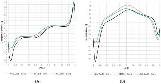 In the central part of the separator , the difference in velocity between the New AAOS and the Ref. AAOS is about 0.1. Near the wall in the inlet , the Ref. AAOS velocity is higher by about 0.3 compared to the New AAOS, while for the opposite wall, the C15RS2 and the New AOSA have almost the same velocities (Figure 15C). Below the vortex finder , the axial velocity was by about 0.3 higher, and at the wall on both sides, the velocity of the Ref. AAOS was higher by about 0.3 compared to the New AAOS, which was due to the absence of oil in this region (Figure 15D). In both lines (L and K), the zero point of tangential velocity is in or close to the axis of the vortex finder. The axial velocity zero point locations are similar for the two lines under consideration and are as follows: − for the left side and about for the right side of the separator (Figure 15B,D).