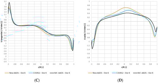 (A) tangential velocity at line L; (B) axial velocity at line L; (C) tangential velocity at line K; (D) axial velocity at line K.