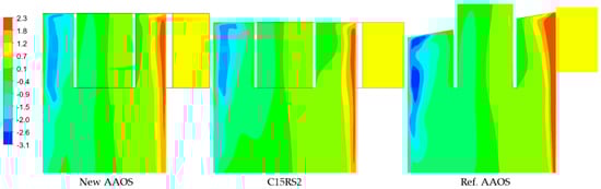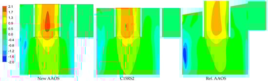Figure 17 presents the contour of the axial velocity on Plane 1−1. For the New AAOS and the C15RS2 configurations, the flow field below the vortex finder shows symmetry of the axial velocity compared to the Ref. AAOS (Figure 15B,D). This is another effect of the structure of the inlet and of the inclination of the separator upper plane.
