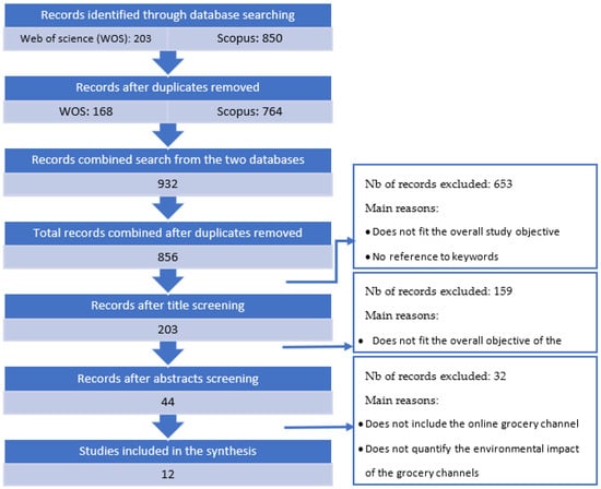 Despite the importance of assessing the environmental impact of e-grocery as an emerging channel, only a few studies have explored this issue. A quick search on the most known databases (the Web of Science, Scopus, and Google Scholar) also confirms this scarcity [32,33,34,35,36,37]. The scarcity of literature focusing specifically on the environmental impact of e-grocery is the main reason for the development of this paper. In fact, the present study is a systematic literature review on energy consumption in terms of CO2 emissions in the e-grocery sector, and thus aims to highlight the environmental impact of e-grocery. The paper also offers a gap analysis and future research agenda to conduct fruitful analyses that deal with online grocery and its environmental impact.