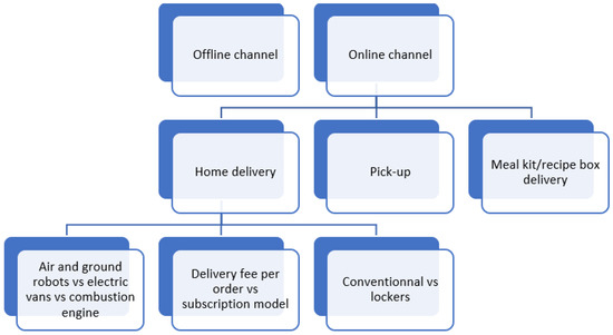 While the offline channel of buying groceries consists of consumers travelling to the physical store of their choice, the online purchase of grocery, in contrast, could generate different delivery options. The studies selected by the present SLR exhibit different types of e-grocery and study their different impact in terms of emissions. Figure 5 shows the various online channels compared and analysed by primary studies. These different channels have different emissions; hence, the interest of analysing various online channels and comparing them to the offline one. Nevertheless, some studies focus on the basic form of the online channel [56] while others make a comparison within online channels only either between the conventional home delivery (HD) and the delivery to lockers [57], or between the HD and the pick-up [58]. These studies offer valuable results regarding online channels emissions and relative energy consumption. However, comparing emissions between the physical grocery retail type and the online one allows grocers to make a choice regarding the development of each form and their environmental implication. A new form of online grocery is to deliver the ingredients of recipes as a way to reduce food waste. The market for online recipe boxes has increased significantly over the past few years due to the convenience of HD and the quality of the produce [59]. These services deliver boxes of pre-portioned ingredients and corresponding recipes directly to consumers, although their energy consumption [60] has yet to be compared to other online/offline forms of grocery shopping.
