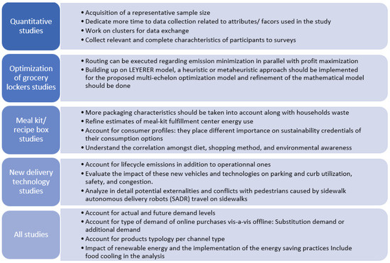 In the context of an SLR, the studies’ limitations construct the path to follow for future research: an in-depth reading of the papers allowed for capturing future research propositions and suggesting other propositions to take into consideration to better assess the environmental impact of e-grocery. Figure 6 represents the future research agenda per study type. Studies are grouped by categories according to major studies and analysed by this SLR. The first group relate to “Quantitative studies” that use quantitative data to build their main model or analysis techniques. Since the outcomes of thess type of studies are based on the sample size, it should be big enough to be representative of the population. Main directives regard the acquisition of complete data either regarding attributes or consumers characteristics and behaviours. The second group is about “Optimization of grocery lockers” studies that focus on the optimization of grocery locker networks and assess their related emissions. Solutions for the optimising problems are mostly based on profit maximization as this is the objective of each company. However, in an environmental assessment context, resolving optimisation problems should also be based on emissions minimization. Researches aimed to improve the study conducted by [57], use a heuristic or metaheuristic approach for the proposed multi-echelon optimization model and refine the mathematical model. The third group assesses and compares the impact of the “meal kit/recipe box” on the environment with regards to other grocery channels. This new type of grocery purchase requires more packaging that can generate important emissions. Hence, accounting for packaging characteristics and household waste will provide better estimates of this channel energy use. Warehouse energy use is also important and should be considered in the analysis. The fourth group includes research that focus on the emissions of the “new grocery delivery technologies”, including drones or unmanned aerial vehicles (UAVs), sidewalk autonomous delivery robots (SADRs), and road autonomous delivery robots (RADRs) [70]. Analysing in detail potential externalities and conflicts with pedestrians caused by SADR travel on sidewalks and evaluating the impact of these new vehicles and technologies on parking and kerb utilization, safety, and congestion are important aspects to consider for upcoming studies.