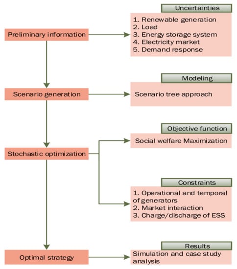 The remaining layout of this paper is organized as follows: Section 2 describes the aim and methodology of the proposed study. A model of the uncertainties associated with wind speed, solar irradiation, and load demand is presented in Section 3. Section 4 presents the VPP market model. Classification of the demand response program is presented in Section 5. Problem formulation, a case study, and simulation results are provided in Section 6. Section 7 provides concluding remarks.