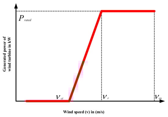 In Equation (2), The Pw and Prated represent the WT output power and rated power, respectively. vci and vco represent the cut-in and cut-out speed, respectively. The rated speed of WT is represented by vr. Figure 2 shows the wind speed power curve of WT.