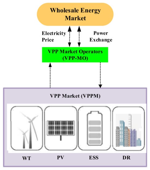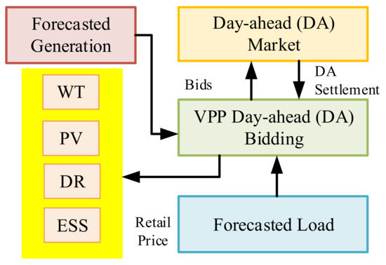 The VPP brings together different distributed energy technologies in the electrical market to improve operational performance and reliability of the power system. In our proposed model, we postulated that we would centrally manage all trading operations taking place inside the VPP structure. Electric energy could be sold and bought on the day-ahead market one day before the scheduled delivery date. Sellers and buyers could present their offers to the market operators for participation in the day-ahead energy market. The owner of the VPP that took part in the day-ahead market (DAM) presented their energy bids and controlled the components of the aggregated bid in a way that maximized overall social welfare. This established how much energy could be purchased or sold on the electricity market. The proposed model is presented in Figure 3 and shows its interaction with the electricity market. The VPP model comprised energy storage, electrical loads, wind farms, photovoltaics, wind, and the DR program. In this study, a direct control method was used to ensure that DERs were coordinated and represented effectively in the market. Figure 4 demonstrates the performance of the VPP market strategy in the day-ahead electricity market.