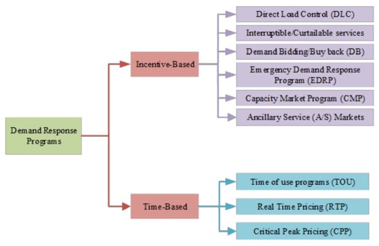 Incentive-based programs are sub-categorized into six sections, including (1) direct load control, (2) interruptible/curtailable services, (3) emergency demand response, (4) demand bidding, (5) capacity market, and (6) ancillary service market [].