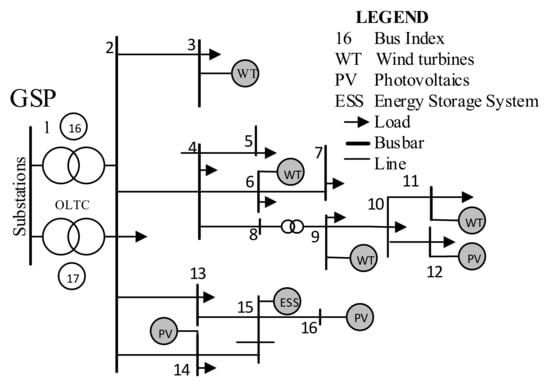 We use a case study to illustrate the effectiveness of the proposed strategy and validate the results. For numerical analysis, a generic 16-bus 33 kV UK generic distribution system (UKGDS) was used. A 16-bus UKGDS single-line diagram is shown in Figure 6. During normal operation, the VPP is connected to the main grid. The ultimate capability of PVs, energy storage systems, and WTs are determined by applying optimal power flow over the planning horizon. In this study, we made the assumption that the distribution network consists of three PV and four WT units. In the distribution network, there are three PV candidate buses with nominal generations of 440 kW, located at positions 12, 14, and 16, and WT candidate buses located at positions 3, 6, 9, and 1,1 with a nominal generation of 660 kW []. The 200 kW energy storage system is installed at their chosen candidate bus at position 15. The upper and lower voltage values are regarded as Vmax = 1.06 p.u. and Vmin = 0.94 p.u []. The active power cost of the DR program is assumed to be 10 $/kW, which is paid to consumers in order to lower load demand at each bus.