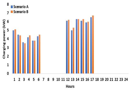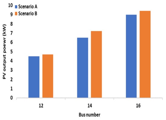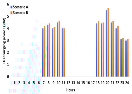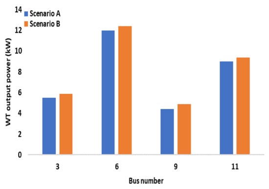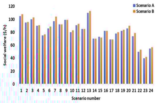 This study considered two different scenarios to assess the influence of the DR scheme on the VPP’s aggregated WT and PV dispatched active power, SW, and the energy storage system, as indicated in Table 1. The total quantity of active power dispatched by WT, PV, and the energy storage system were investigated and compared for scenarios A and B. The total quantity of active power dispatched by WT and PV for scenarios A and B at each candidate bus is shown in Figure 7 and Figure 8. The total quantity of active power delivered by WTs and PV is evidently higher in scenario B, with DR scheme integration, than in scenario A. The justification of busbars with the highest power dispatch for each energy system is shown in Table 3. The energy storage unit has two modes of operation: when energy price is low, it operates as a load and stores energy, and when energy price is high, it operates as a producer of energy and sells it on the market at a profit. Figure 9 and Figure 10 illustrate that scenario B, which employs a demand response strategy, had more charging and discharging of the energy storage unit than in scenario A. This was because the DR scheme allowed for the shifting of some loads to other low-demand periods. Furthermore, according to Figure 9, the ES unit was scheduled to charge at times 1–6 and 12–17 h (off-peak hours). During these hours, the ES unit was charged with a total of 49.3 kW of power. According to Figure 10, the ES unit was scheduled to discharge during times 7–11 and 18–24 h (peak hours). The ES unit discharged a total of 49.2 kW of power. The ESS performed well in terms of flattening the load curve and improving grid stability. This mitigated the dependency of VPP on the utility grid and also lowered its overall energy cost. The social welfare for both scenarios is shown in Figure 11. As can be observed, the SW is greater in scenario B than in scenario A. This is primarily attributed to DR scheme integration and the increased active power dispatched in scenario B, which allowed for a higher SW.