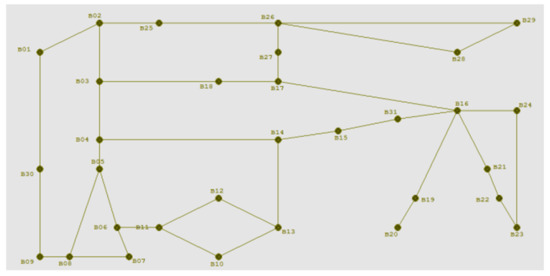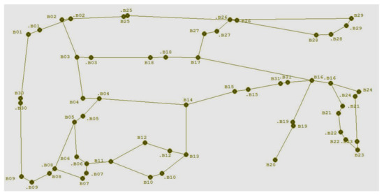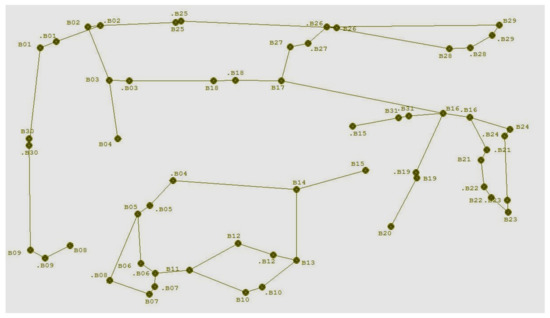 This system was chosen because it can be treated as a large system (there are quite a large number of nodes in it, several of which are extended substations) in which it is possible to separate several smaller subsystems without changing the parameters of the power sources or loads. In addition to this, it is small enough that a separation can easily be made, which will serve to convey the idea of the method for the purposes of this article. The representation by means of it will be more illustrative than by using a large test system, such as IEEE 118, in which there are many more dependencies between nodes and, for the purposes of the article, it is too extensive (it will be used in a further stage of research work on the topic under discussion).